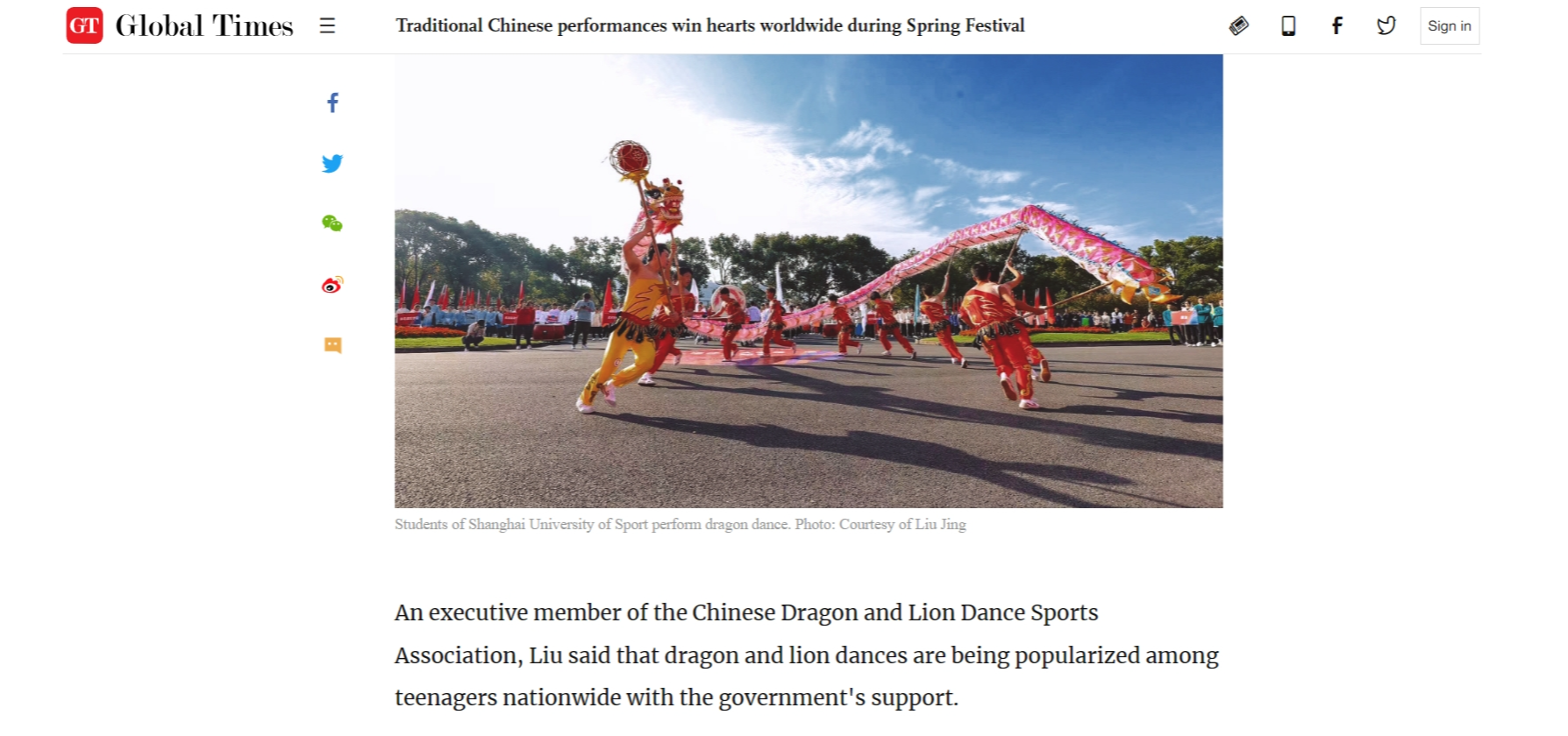 正值甲辰龙年春节之际,近日,由人民日报社主办与出版的国际新闻报刊《环球时报》(Global Times)英文版、中文版采访我院博士生导师刘静教授,报道中国龙狮文化的国际化传播以及我院舞龙舞狮项目的发展,受到广泛关注。