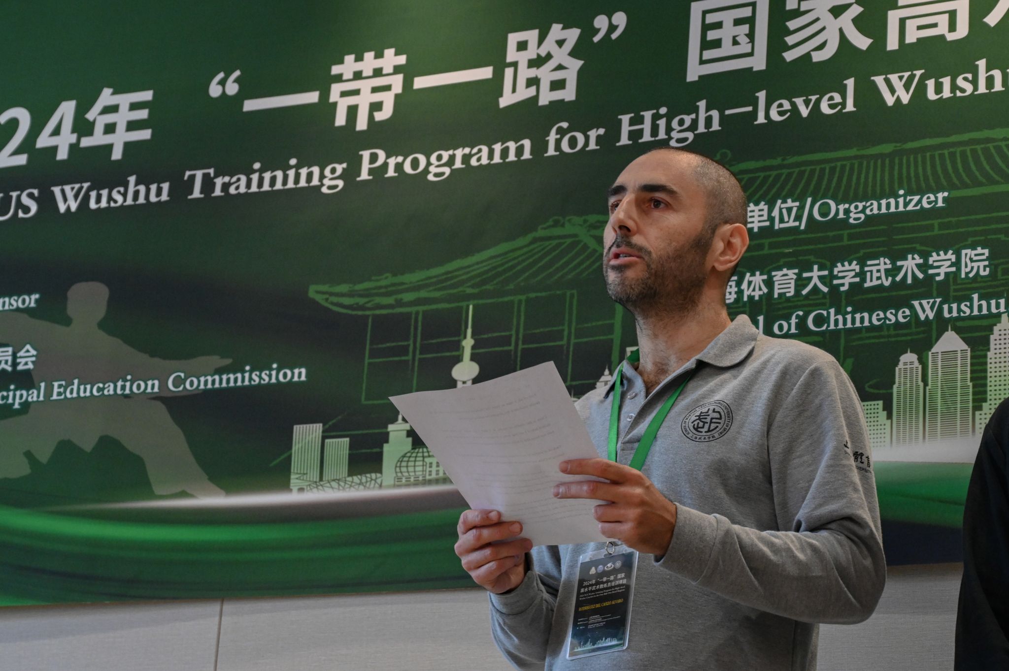 来自西班牙的学员Álvaro作为学员代表进行了发言,他表示,能来到中国参与本次项目的感激,希望通过本次武术培训提升专业技术,近距离了解中国文化,回国后将武术传播给更多人。