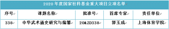 2020年12月3日,全国哲学社会科学工作办公室公布了2020年度国家社会科学基金重大项目立项名单,我院申报的《中华武术通史研究与编纂》获批立项。同年,我院李守培副教授《明代书院武艺文献整理与研究》获批国家社会科学基金青年项目。