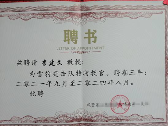 2021年9月5日,我院李建文老师被中国人民武装警察部队某总队某支队正式聘任为“雪豹突击队”特聘教官。