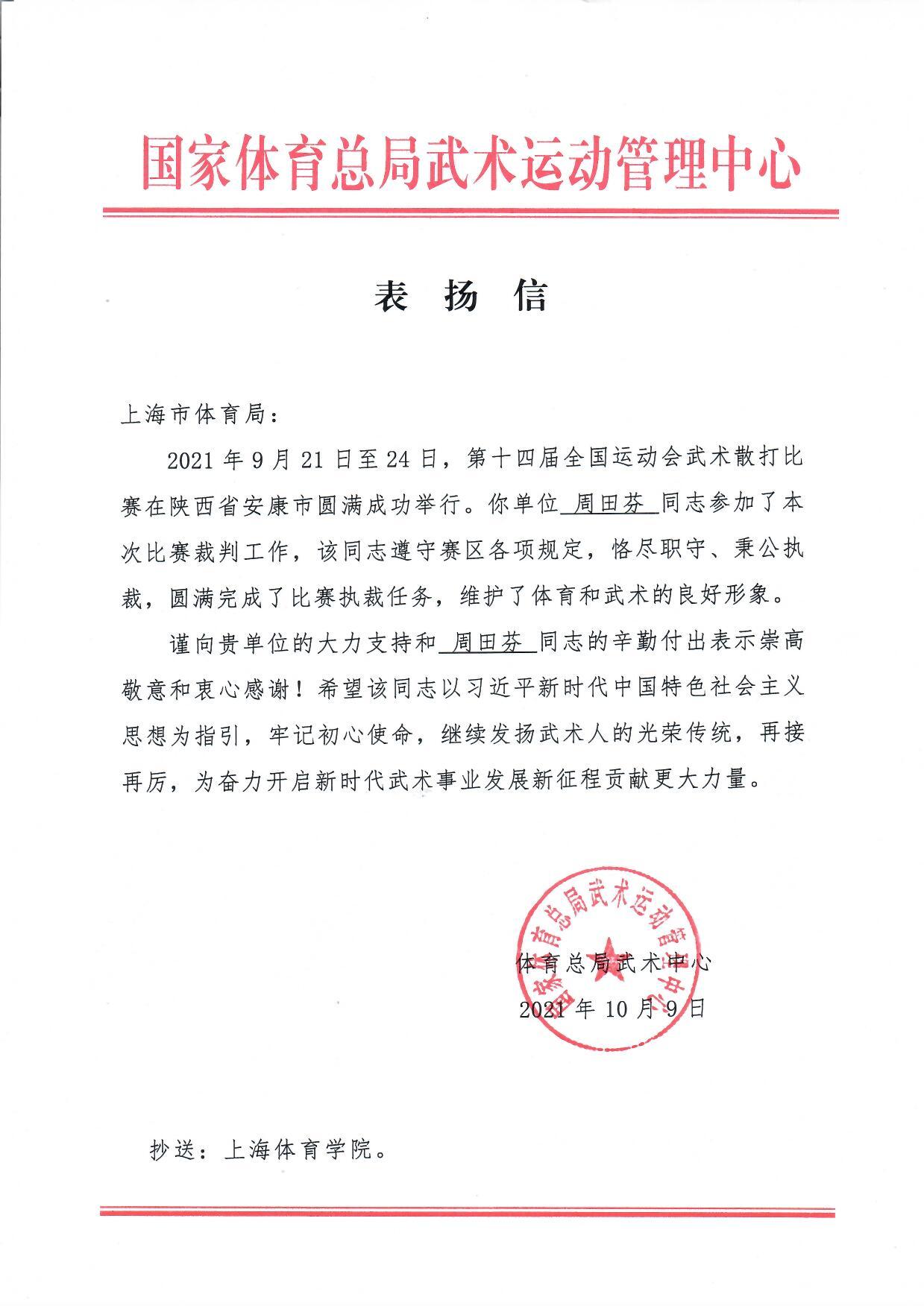国家体育总局武术运动管理中心发给我院教师周田芬的表扬信