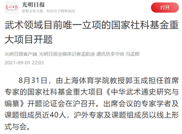 8月31日,武术领域唯一立项的国家社科基金重大项目《中华武术通史研究与编纂》顺利开题,近40位专家学者及课题组成员与会。专家组一致认为项目研究设计政治站位高、规模宏大、视野开阔、思路清晰、方法新颖,展现出课题组雄厚的研究实力、扎实的工作基础、高远的学术追求,代表了新时代武术研究的新境界。光明日报等媒体对此专题报道。