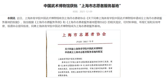 4月26日,中国武术博物馆加入中国博物馆协会,后又获批“上海市志愿者服务基地”。我院学生获“全国体育系统十佳科普讲解员”“2021全国高校讲解案例展示比赛一等奖”,指导教师刘玥婷获“全国高校讲解案例展示优秀指导老师”称号。举办“天下龙泉:宝剑青瓷传承与创新展”,并在沪上16所中小学进行巡展。国家体育总局健身气功管理中心、中国健身气功协会委托王震教授团队编创“帕友方”,受到人民网、新华社新媒体、学习强国等报道。