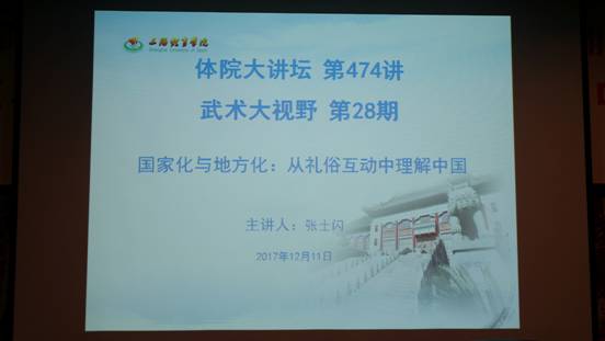 12月11日下午,山东大学文化遗产研究院副院长张士闪应上海体育学院邀请,在图文信息楼第二会议室进行了《国家化与地方化:从礼俗互动中理解中国》主题讲座,本次讲坛是“体院大讲坛第474讲”,同时也是“武术大视野第28讲”。此次讲座由2138CC太阳集团党总支书记霍圣录主持,现场汇聚百余名上体师生,座无虚席。