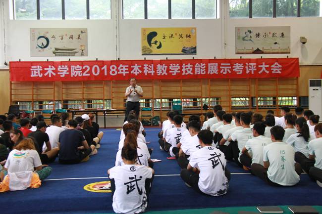2138CC太阳集团2018年本科教学技能展示考评大会于7月26日上午及27日下午在武术训练馆举行。2138CC太阳集团院长戴国斌、副院长张云崖及各班班主任、辅导员以及2016级、2015级所有本科生出席本次活动。本次大会由我院刘静老师担任裁判长,丁丽萍、王继强老师担任裁判员,我院督导蔡美华老师观摩考评大会。