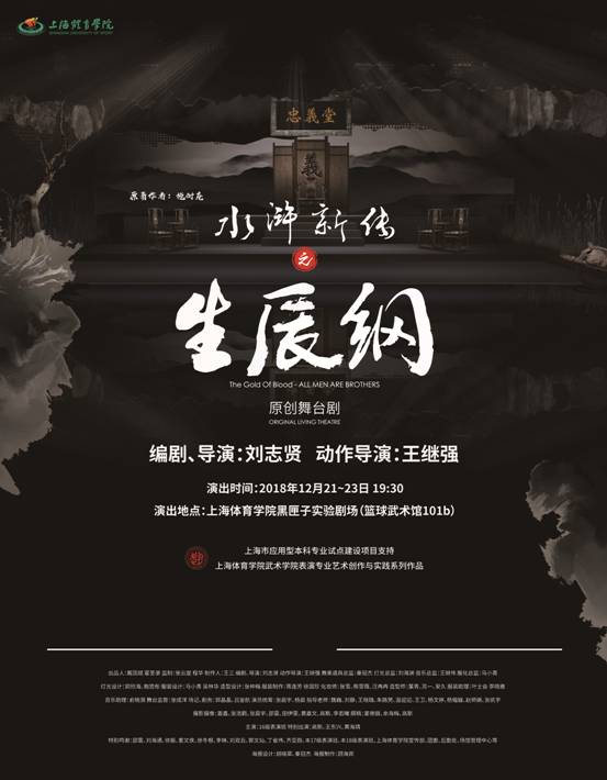 《水浒新传之生辰纲》(下简称为《生辰纲》)是首部完全由“上体武术表演人”原创的舞台剧作品,更是一部富有创世意义的舞台剧作品。它将中国功夫元素合理、巧妙、真实还原、再现式地嵌入到戏剧表演环节之中,开启国内舞台艺术产业中的一个全新的领域,也是上体武术表演专业人才培养的经典剧目。