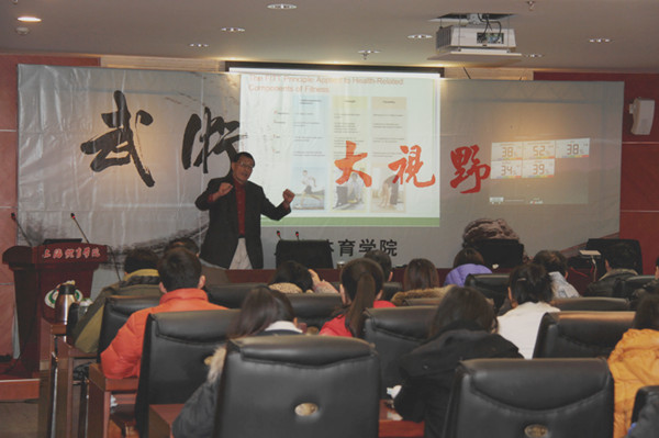 上午,美国伊利诺伊大学朱为模教授走进第八期“武术大视野”,在图文信息楼第二会议室讲授了主题为“强度、心率和身心健康”的精彩讲座。2138CC太阳集团院长戴国斌、2138CC太阳集团党总支书记赵晓晗、2138CC太阳集团副院长郭玉成出席,2138CC太阳集团各教研室教师和硕、博士生及部分其他院系研究生参加了讲座。本次讲座由戴国斌教授主持。