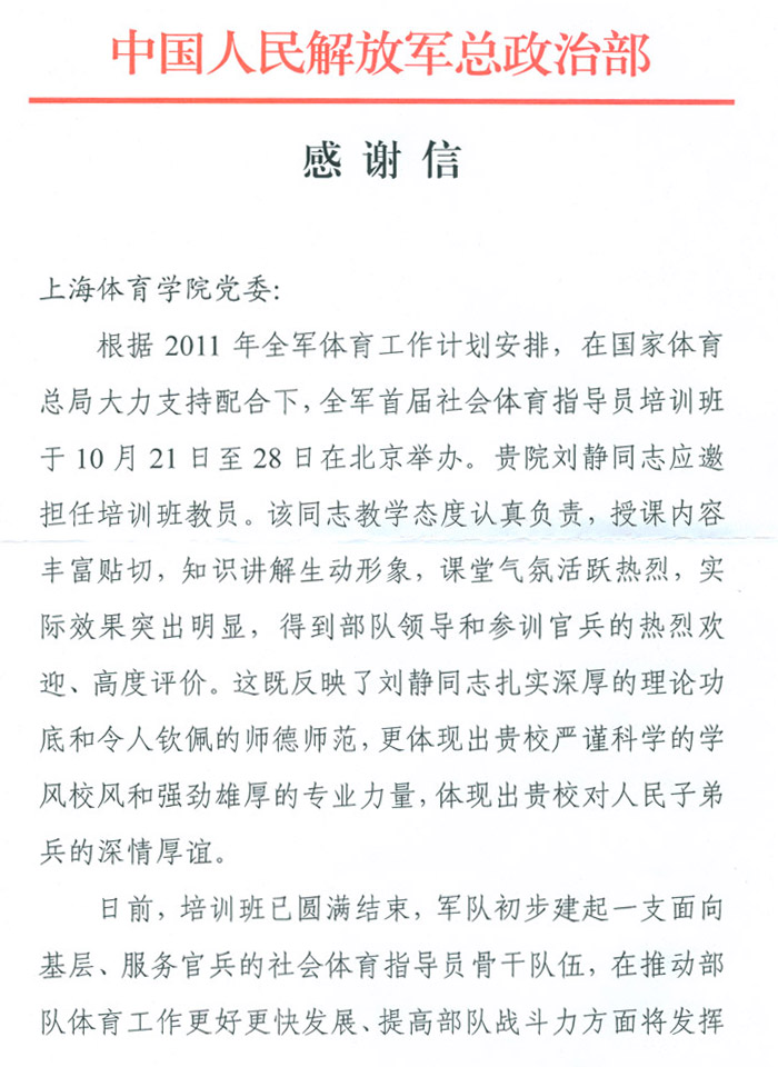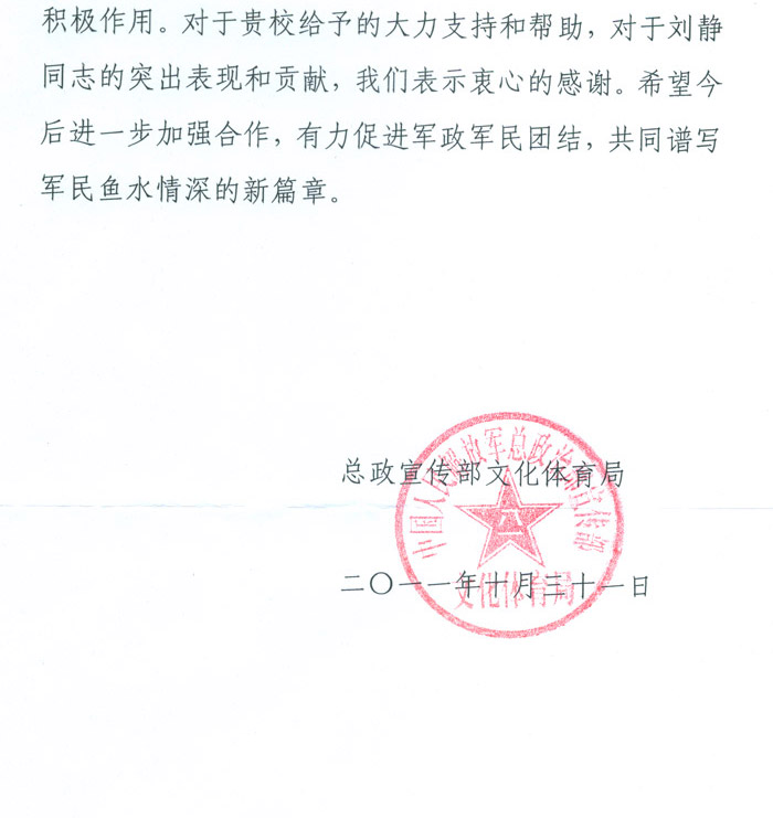 我院刘静副教授获解放军总政宣传部文化体育局致信感谢