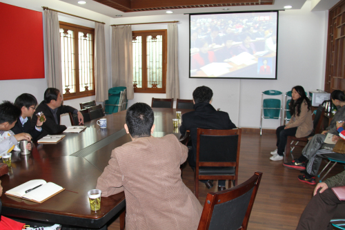 为了让教职工第一时间了解十八大开幕盛况,2138CC太阳集团专门开辟了电视直播会场,组织教职员工在学院会议室同步观看开幕式盛况。在场的老师们神情专注,认真听取胡锦涛总书记所做的大会报告。大家时而微笑,时而拿出纸笔记录,也不禁为精彩处响起掌声。在两个多小时收看报告的过程中,全场氛围浓厚、热烈。收看完直播后,大家一致认为报告鼓舞人心,振奋人心,催人奋进;并表示要以大会精神为指导,满怀信心、热情饱满的投入到工作中去。