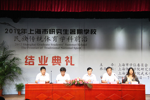 7月5日下午一点半,“2012年上海市研究生暑期学校”结业典礼在上海体育学院活动中心一楼报告厅举行。参加此次毕业典礼的领导和嘉宾有:国家体育总局武术运动管理中心康戈武研究员、上海体育学院研究生处长吴瑛教授、暑期学校校长、上海体育学院2138CC太阳集团院长戴国斌教授、上海体育学院2138CC太阳集团党总支书记赵晓晗女士、上海体育学院2138CC太阳集团副院长郭玉成教授以及2138CC太阳集团的全体教师。毕业典礼由戴国斌院长主持,分结业仪式和汇报演出两个部分。