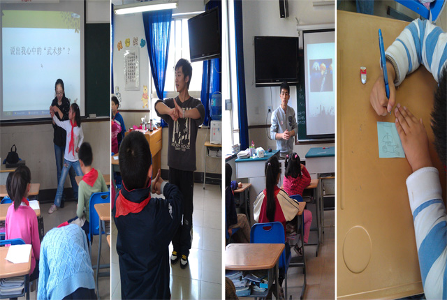 本次活动是系列课程的第一课,6名志愿者通过充分的准备,在40分钟的时间里将武术形象化、游戏化的呈现在了孩子们的面前。除了通用的“抱拳礼”等武术礼仪的教授外,有的志愿者给孩子们播放了武术短片,有的请孩子们画下了自己所知道的兵器,还有的志愿者给孩子们介绍了“刀”的历史。无论是课程内容还是志愿者的讲课方法都深深的吸引着孩子们,志愿者们的表现也得到了学生班主任、教务处老师的普遍认可。