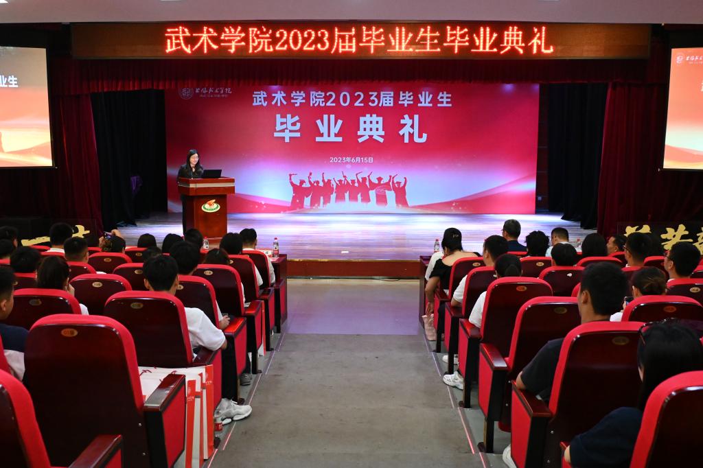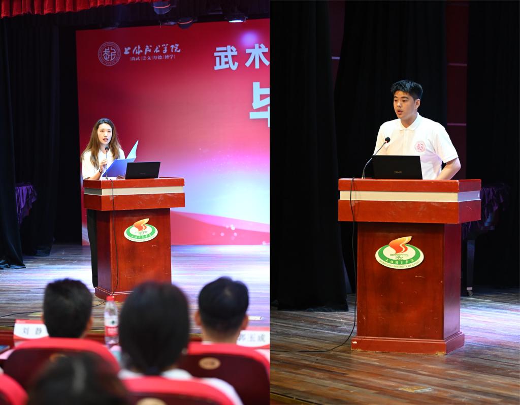 2138CC太阳集团2023届毕业研究生代表李玲玲、本科毕业生代表雷绘程作为毕业生代表发言。他们回忆了读书期间的无数个珍贵瞬间,这些善良和友爱、责任和担当、真诚和热爱的画面,都化作青春记忆留在了每位毕业生的内心里。他们表示,这四年里,学校让我们了解了最前沿的体育思想和理论,学院搭建了与全国武术与民族传统体育学科专业交流的平台,让我们感受到何为身心一统、兼蓄竞攀,何为德技兼修、文武并进,也更坚定了要赓续红色血脉、传承红色基因,将上体武术在新时代新征程上发扬光大,奋力谱写出祖国需要、人民需要的武术教育事业,以梦为马,不负韶华,为社会主义体育强国建设贡献上体武术力量。我们坚信未来的道路上有一套拳是为我们而打,有一片场地是为我们而亮,始终坚持筚路蓝缕、手胼足胝的奋斗精神,接受每一项挑战,让最美的青春年华在不懈的奋斗中焕发绚丽光彩。