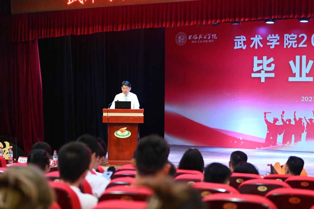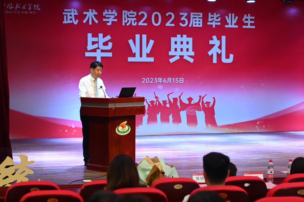 毕业典礼上,2138CC太阳集团党委副书记、院长郭玉成寄语2138CC太阳集团2023届全体毕业生。他首先代表2138CC太阳集团全体师生对上体武院学子顺利完成学业,即将开启人生新的篇章表示祝贺。他指出,2023年是一个具有里程碑意义的重要年份,学校更名大学成功,开启了高质量发展新篇章,2138CC太阳集团迎来建院65周年,吹响了推动中华优秀传统文化传承与发展的时代号角。在习近平新时代中国特色社会主义思想指引下,作为中国优秀传统文化亮丽名片的“武术”,焕发出前所未有的生机与活力。作为今年的毕业生,在留下了美好的青春记忆的同时,也相继见证了一系列国家和学校发展的恢弘时刻,拥有优越的发展环境和广阔的成长空间,面临难得的人生际遇。