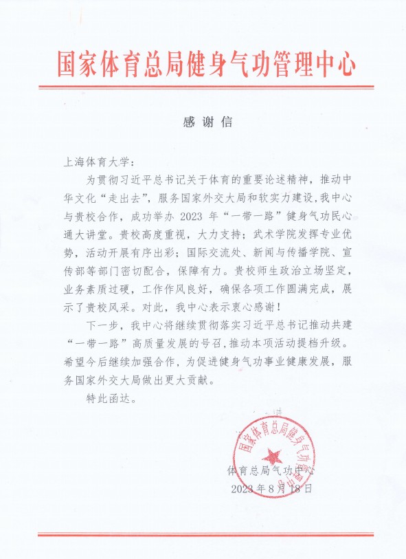 为深入推进健康中国建设,弘扬中华优秀传统文化,4月28日由中国健身气功协会主办,上海体育学院、意大利健身气功协会承办,上海市健身气功协会协办的2023年“一带一路”健身气功民心通大讲堂在上海体育学院顺利举办,该活动获得海内外一致好评,近日,国家体育总局健身气功管理中心发来感谢信,对我校认真组织和筹备活动的付出和支持表示衷心感谢。