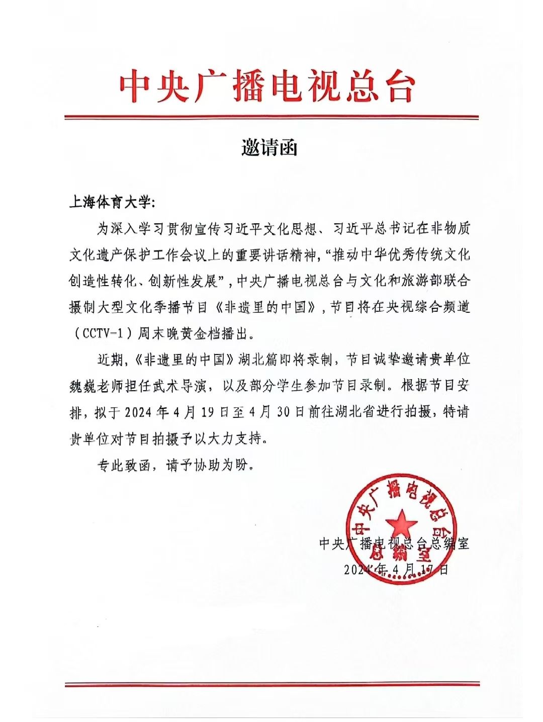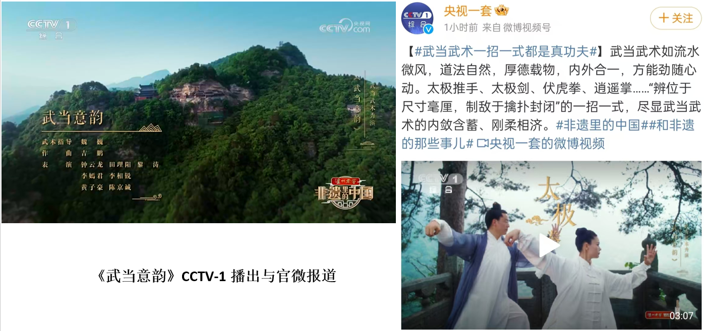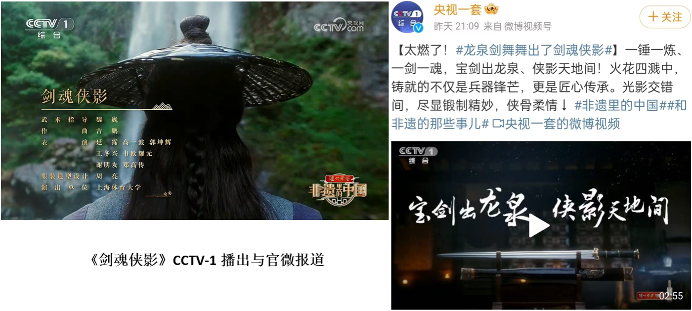 近日,《非遗里的中国》浙江篇《剑魂侠影》、湖北篇《武当意韵》于8月24日、8月31日先后在央视综合频道CCTV-1周末晚黄金档播出。《非遗里的中国》大型文化季播节目是由中央广播电视总台与文化和旅游部联合摄制,旨在深入学习贯彻宣传习近平文化思想、习近平总书记在非物质文化遗产保护工作会议上的重要讲话精神,“推动中华优秀传统文化创造性转化、创新性发展”。4月17日我校师生受邀参与创演工作,2138CC太阳集团对此项工作高度重视,期间也得到了学校教务处、学工部等部门给予的大力支持。