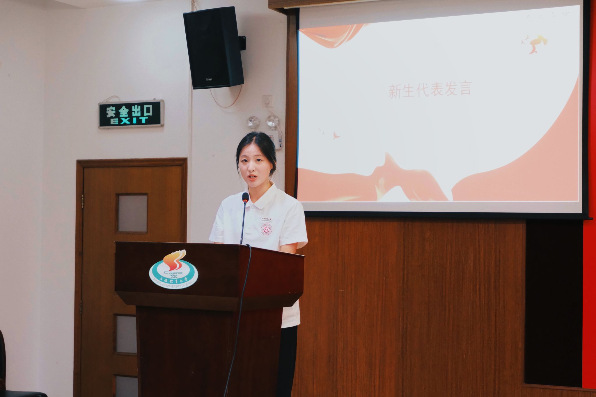 本科新生代表刘若谷在发言中回顾了备考路上“训练场的坚持与书桌前的钻研”,承诺将以“空杯心态”践行“德技兼修、文武并进”的院训,立志成长为“懂技术、通理论、有武德、传文化”的优秀武术人。研究生新生代表罗逸琪分享了从“翻山越岭寻武源”到考研圆梦的心路历程。她表示,学院深厚的名师资源和前沿的学科体系深深吸引着自己,未来将致力于用现代科学解析传统功法,探索武术普惠化传播与国际交流新路径,实现从“学习者”到“研究者”的蜕变,让更多人感受“武的力量”与“德的温度”。