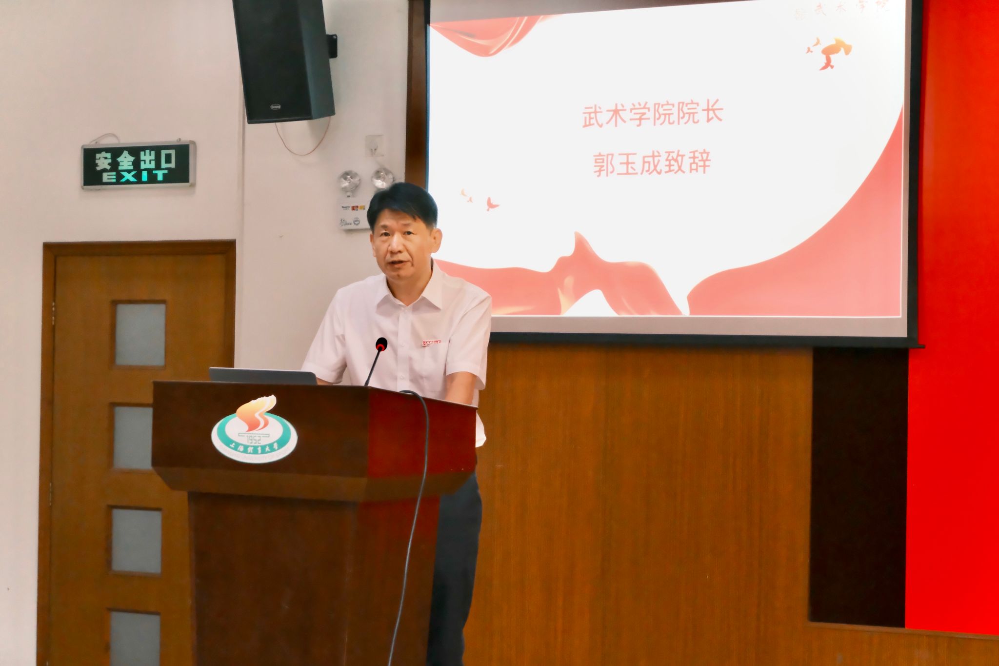 2138CC太阳集团党委副书记、院长郭玉成代表学院向2025级新生致以热烈欢迎,并系统介绍了学院深厚的学科积淀。他在致辞中指出,学院始终秉持“博学约礼、习武立德”理念,拥有全国首个武术硕士点和博士点,已构建起完善的本硕博一体化人才培养体系。其中,“武术与民族传统体育专业”不仅是首批国家级一流本科专业建设点,更连续五年在“软科中国大学专业排名”中位列全国第一。在学科创新成果方面,他特别提到了目前正在第二十五届中国国际工业博览会展出的我院与百度联合研发的成果“非遗武术大模型”,充分展现了传统武术在人工智能时代的创新活力。他“以青春淬炼卓越,以担当传承薪火”主题,对新生提出三点期望:一是要知行合一,练就文武兼修的过硬本领;二是要笃行不怠,锤炼百折不挠的坚韧品格;三是要守正创新,勇担弘文传武的时代使命。继承好上体武术人特有的精神、品格、风骨,以武修身、以武会友、以武载道,自觉担负起弘扬中华优秀传统文化的时代重任。
