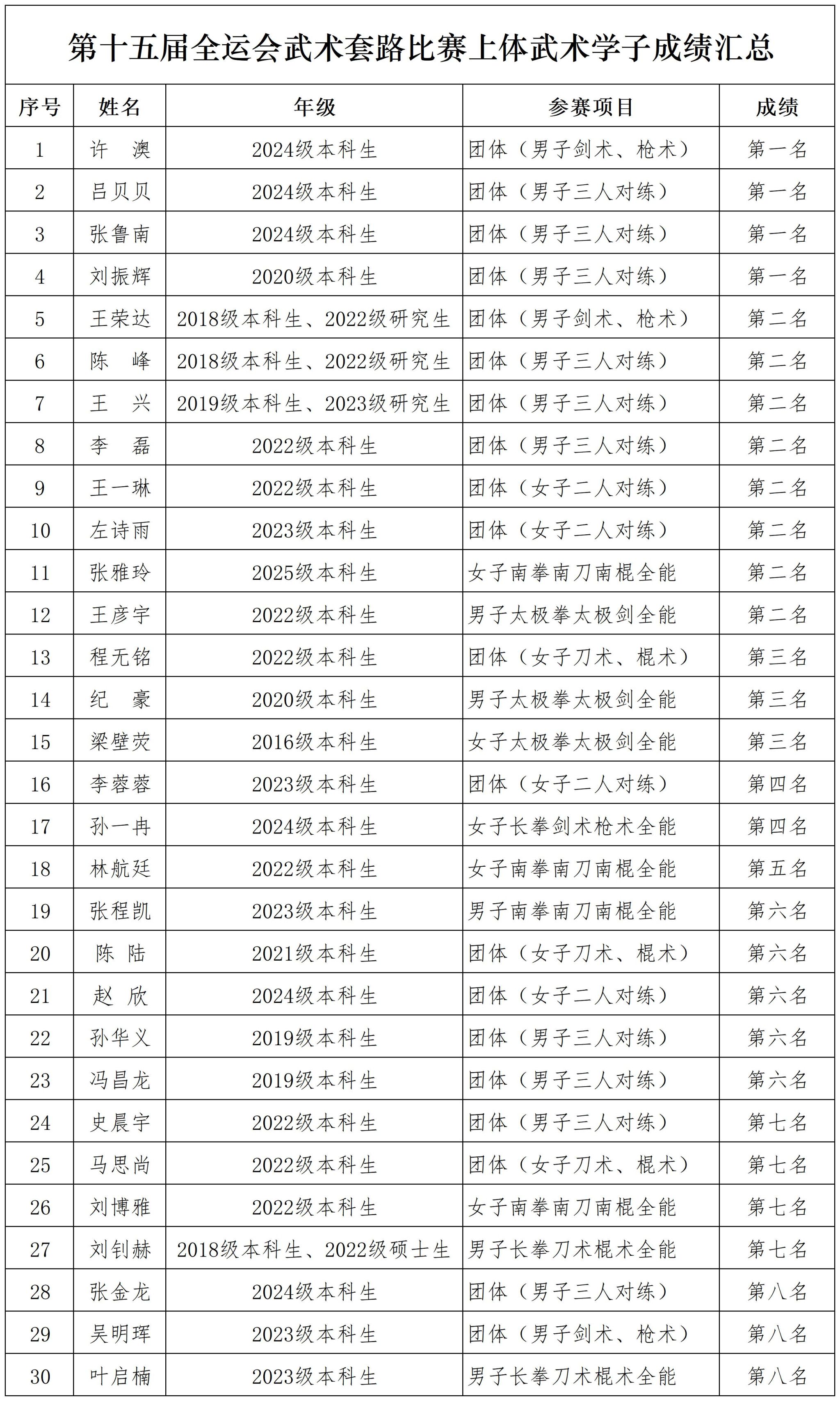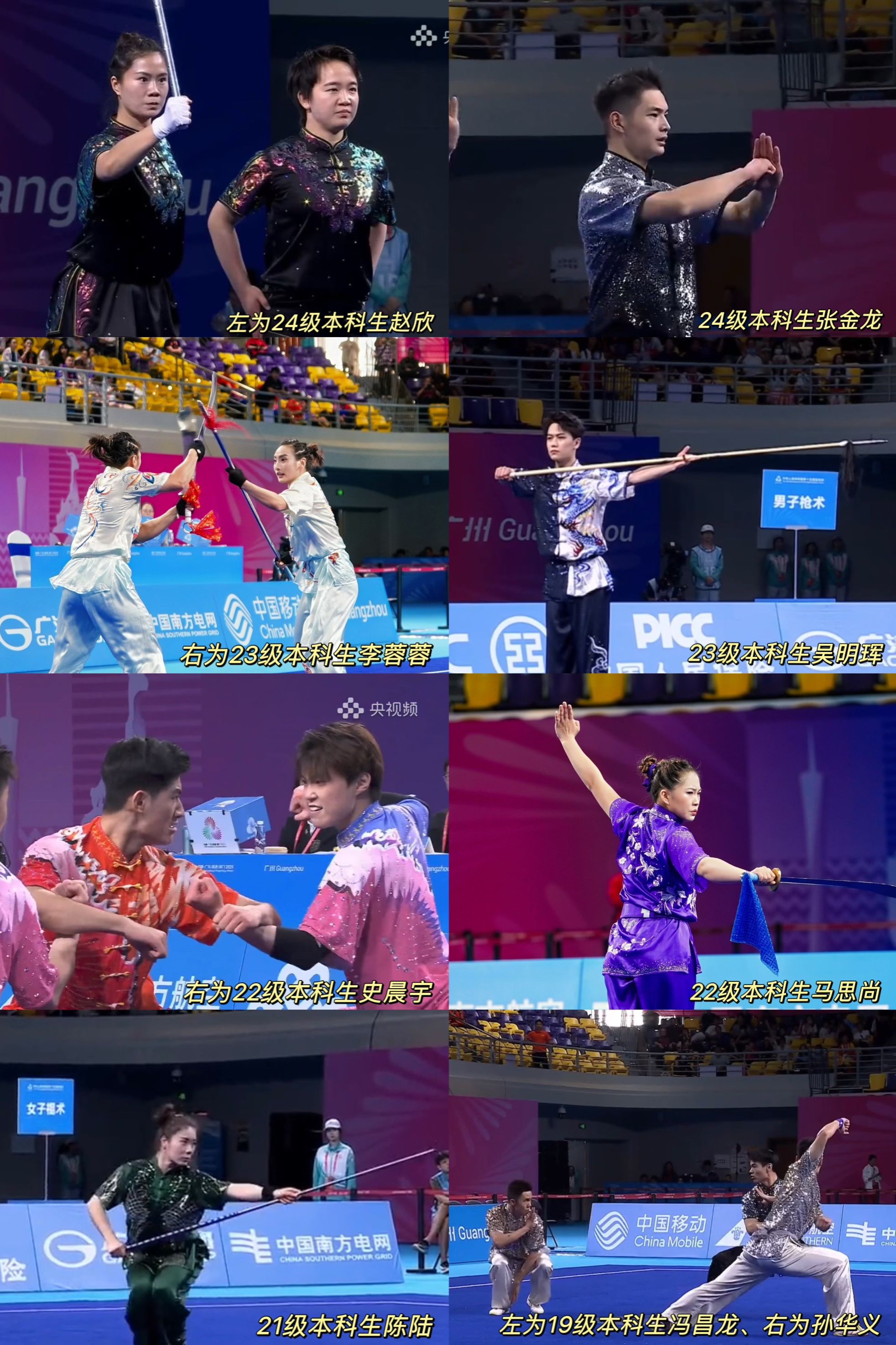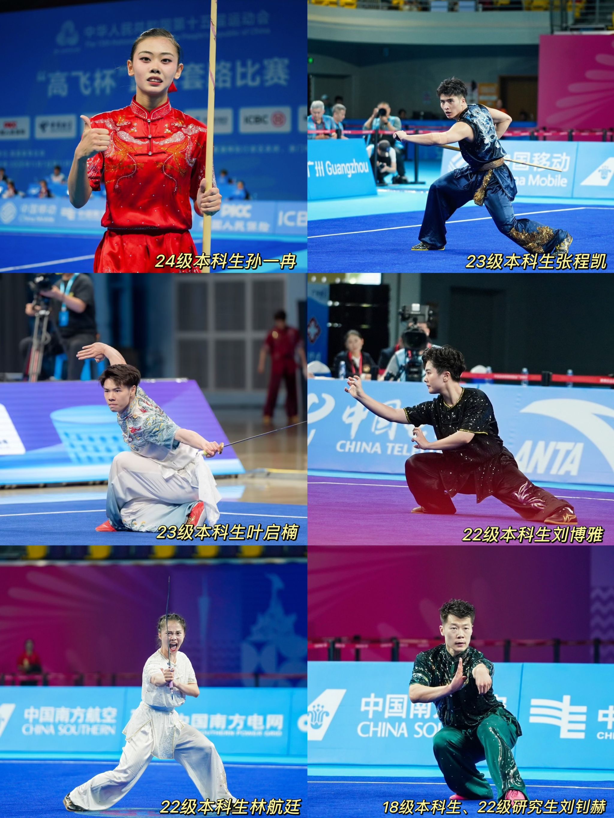18级本科生、22级硕士生王荣达、陈峰,19级本科生、23级硕士生王兴,22级本科生李磊、王一琳,23级本科生左诗雨分别在男子刀术棍术、男子三人对练及女子二人对练项目中表现优异,成功斩获团体银牌。25级本科生张雅玲与22级本科生王彦宇,继2025年世界武术锦标赛和2024年世界太极拳锦标赛夺冠后,再次于全运会舞台绽放光彩,二人延续高水准表现,凭借沉稳发挥与出色动作质量,分获女子南拳南刀南棍与男子太极拳太极剑全能项目第二名。