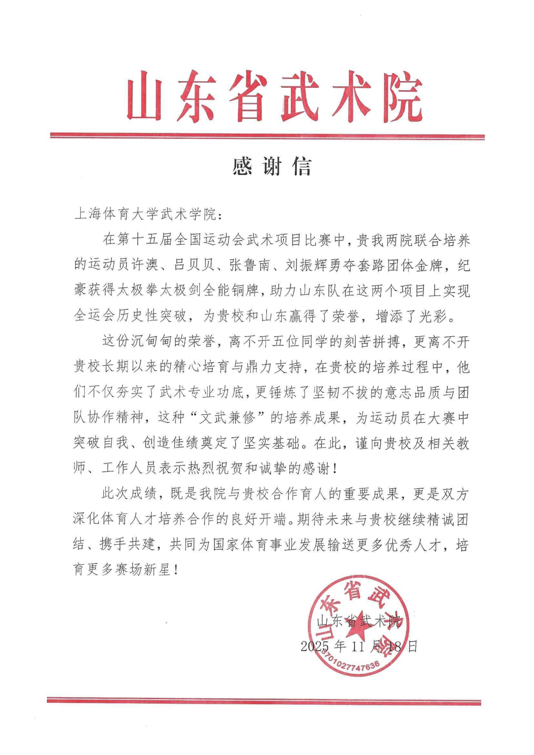 近日,山东省武术院向我院发来感谢信。在第十五届全国运动会武木项目比赛中,我院2024级本科生许澳、吕贝贝、张鲁南和2020级本科生刘振辉勇夺套路团体金牌,2020级本科生纪豪获得太极拳太极剑全能铜牌,实现山东队在全运会上的历史性突破。