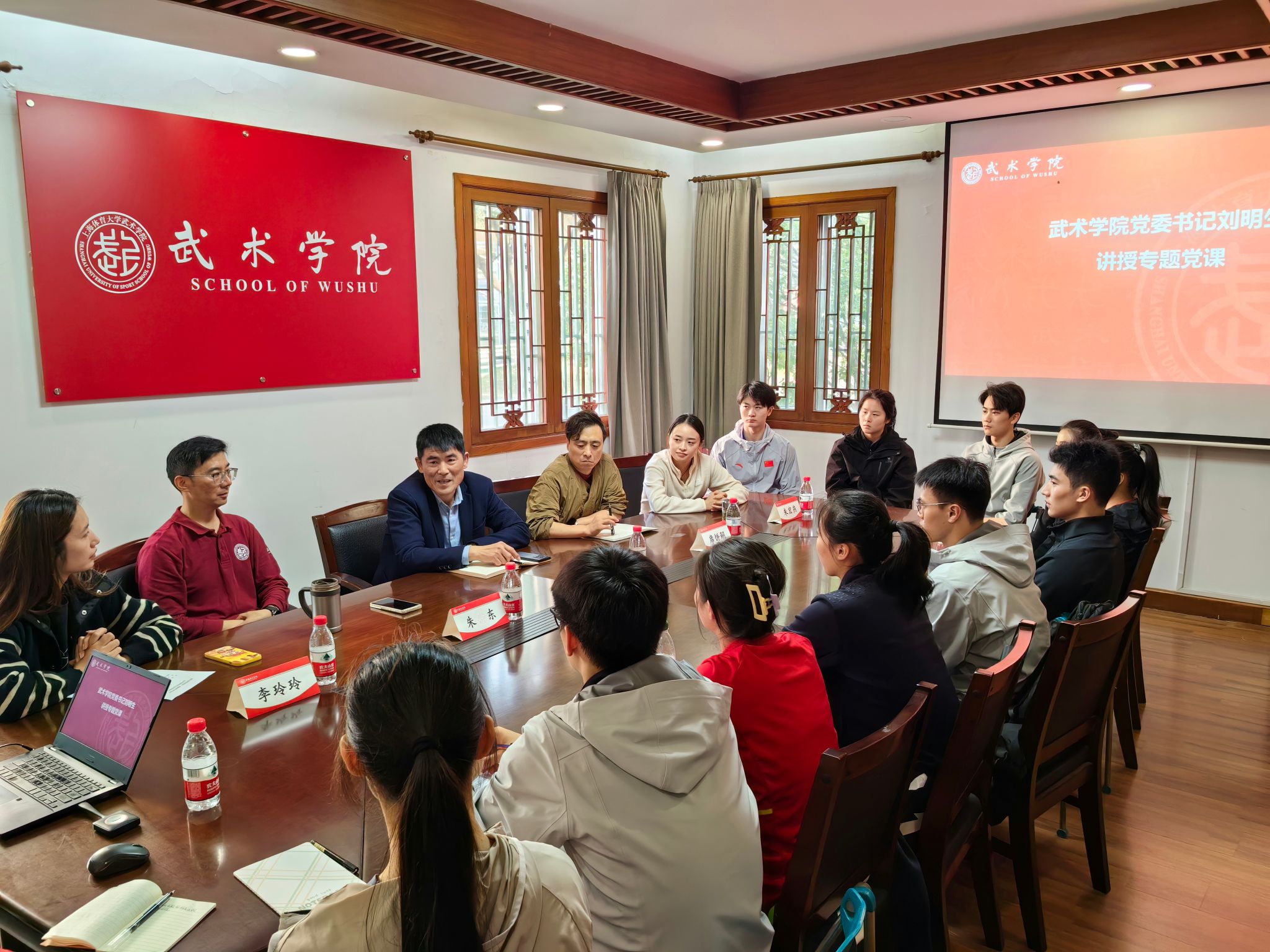刘明生书记为优秀运动员讲授专题党课。他谈到,上体武术近年来在学校党委的坚强领导下,全院师生抓住机遇、乘势而上,在教书育人、理论建构、文化传播、健体强国等领域弦歌不辍,彰显了强劲的示范力与引领力。同学们既生逢于中华民族发展的最好时期,又赶上了学校高质量发展的时代机遇,拥有优越的发展环境和广阔的成长空间。作为高水平武术运动员,要做到胸怀大局,勇于承担使命责任,迎难而上。在赛场上勇往直前,追求卓越,不断突破。他勉励同学们要矢志奋斗,勤于学习,无论是顺境还是逆境,都保持斗志昂扬、积极向上的精神风貌,坚持自己所热爱的武术事业,追求梦想,实现梦想。