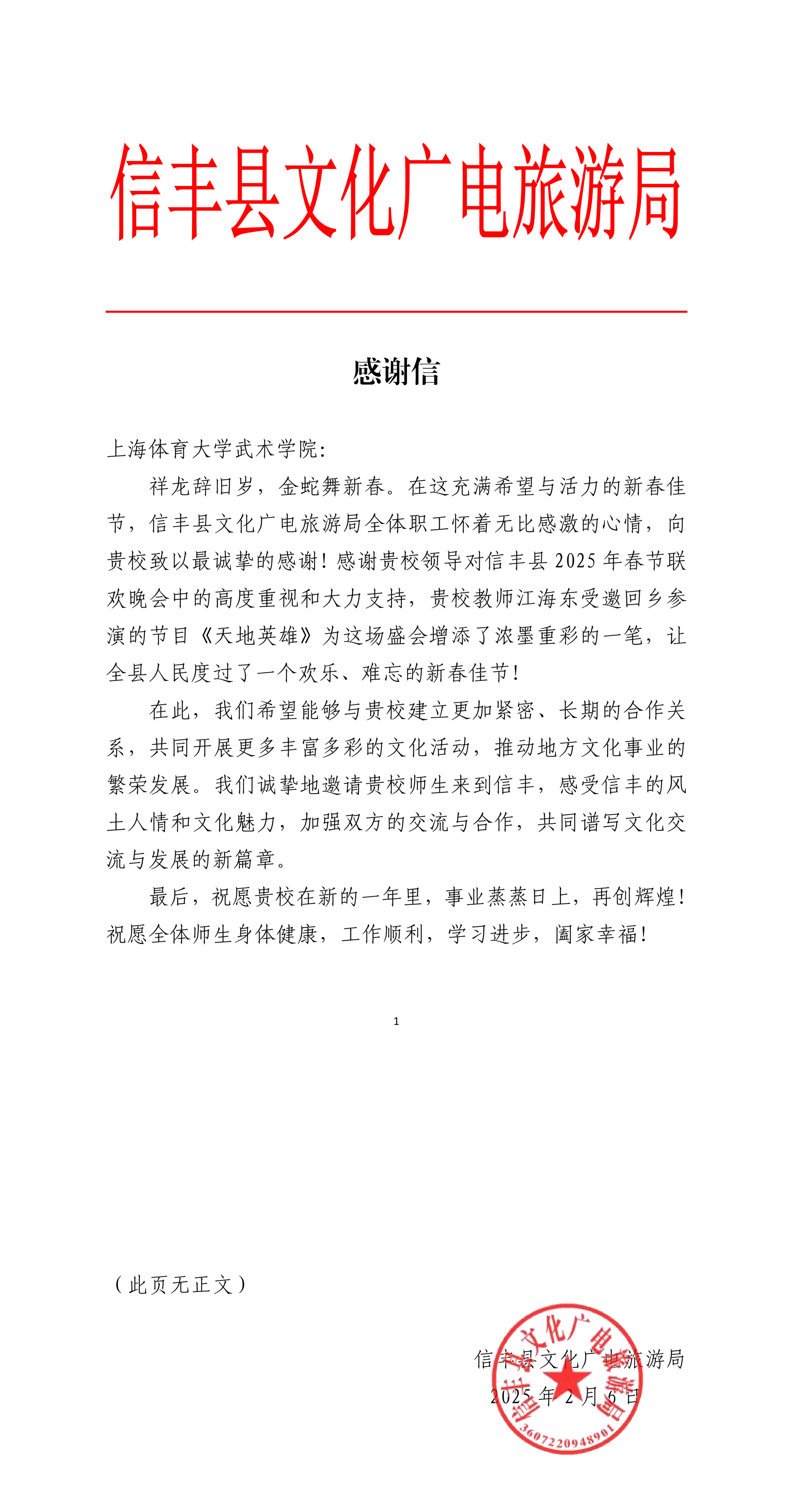 近日,学院收到信丰县文化广电旅游局发来的感谢信,信中对我院党员教师江海东为推动当地文化事业发展作出的积极贡献表达了诚挚的问候和衷心的感谢。春节期间,我院党员教师江海东回乡参演信丰县2025年春节联欢晚会武术节目《天地英雄》。作为杭州亚运会、世界武搏运动会双料武术冠军,江海东以武术为纽带,将传统武术与现代艺术相融合,为当地百姓呈现了一场兼具文化深度与武术感染力的演出。