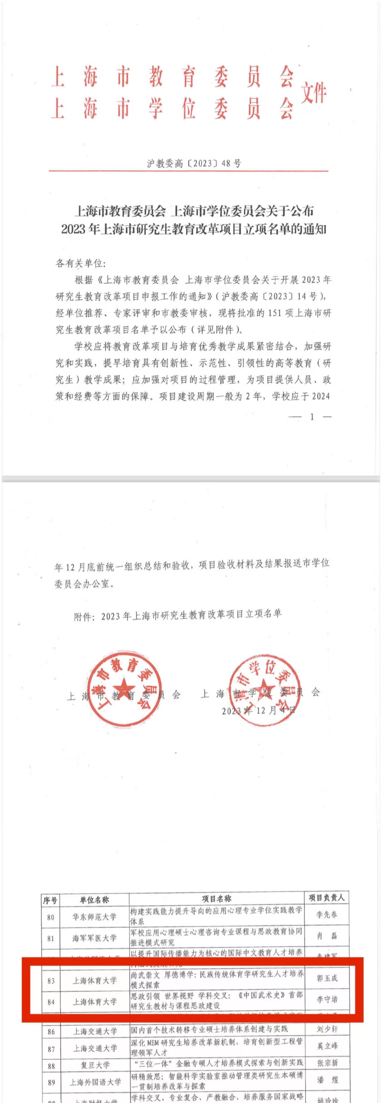 12月,上海市教育委员会、上海市学位委员会公布了2023年上海市研究生教育改革项目的立项名单。我院郭玉成教授负责的《尚武崇文 厚德博学:民族传统体育学研究生人才培养模式探索》、李守培教授负责的《思政引领 世界视野 学科交叉:<中国武术史>首部研究生教材与课程思政建设》成功获批立项。