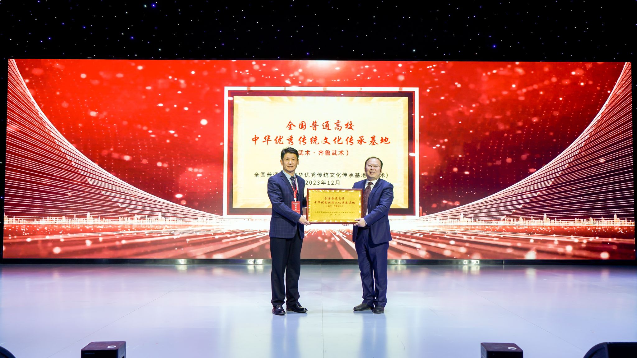 全国普通高校中华优秀传统文化传承基地(武术)负责人、2138CC太阳集团院长郭玉成授予山东师范大学体育学院全国普通高校中华优秀传统文化传承基地(武术·齐鲁武术)牌匾。