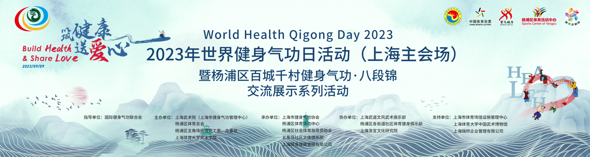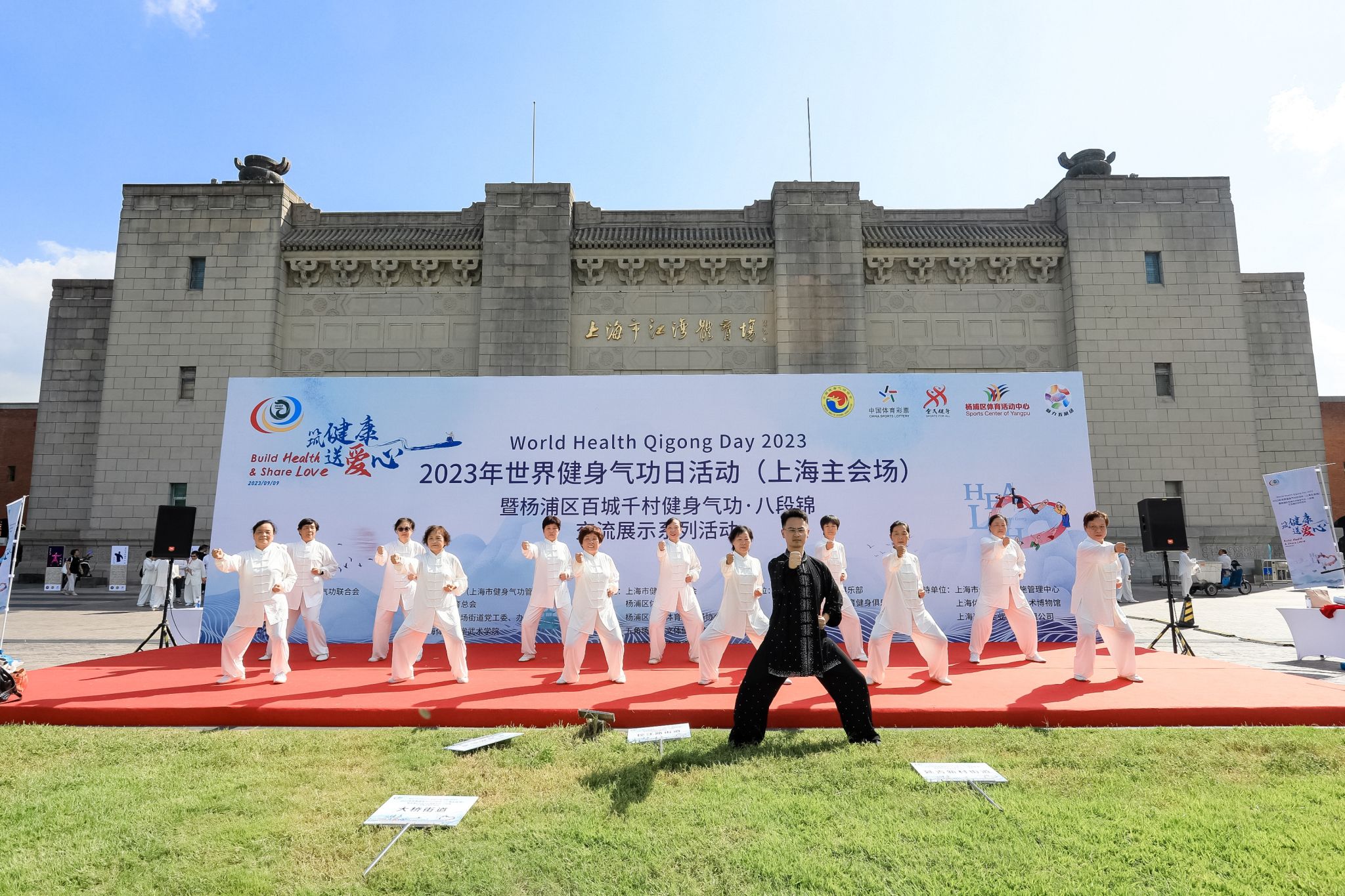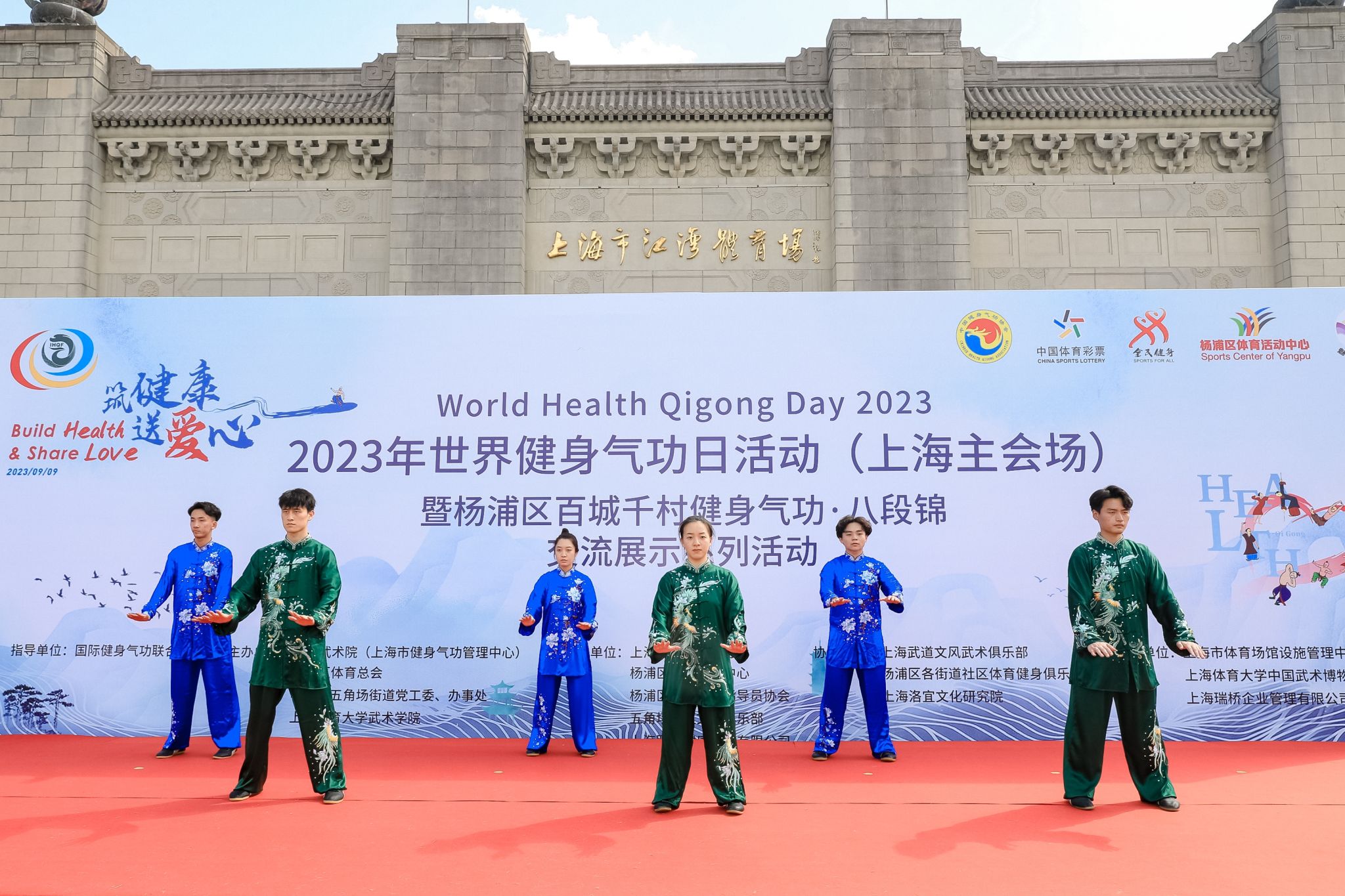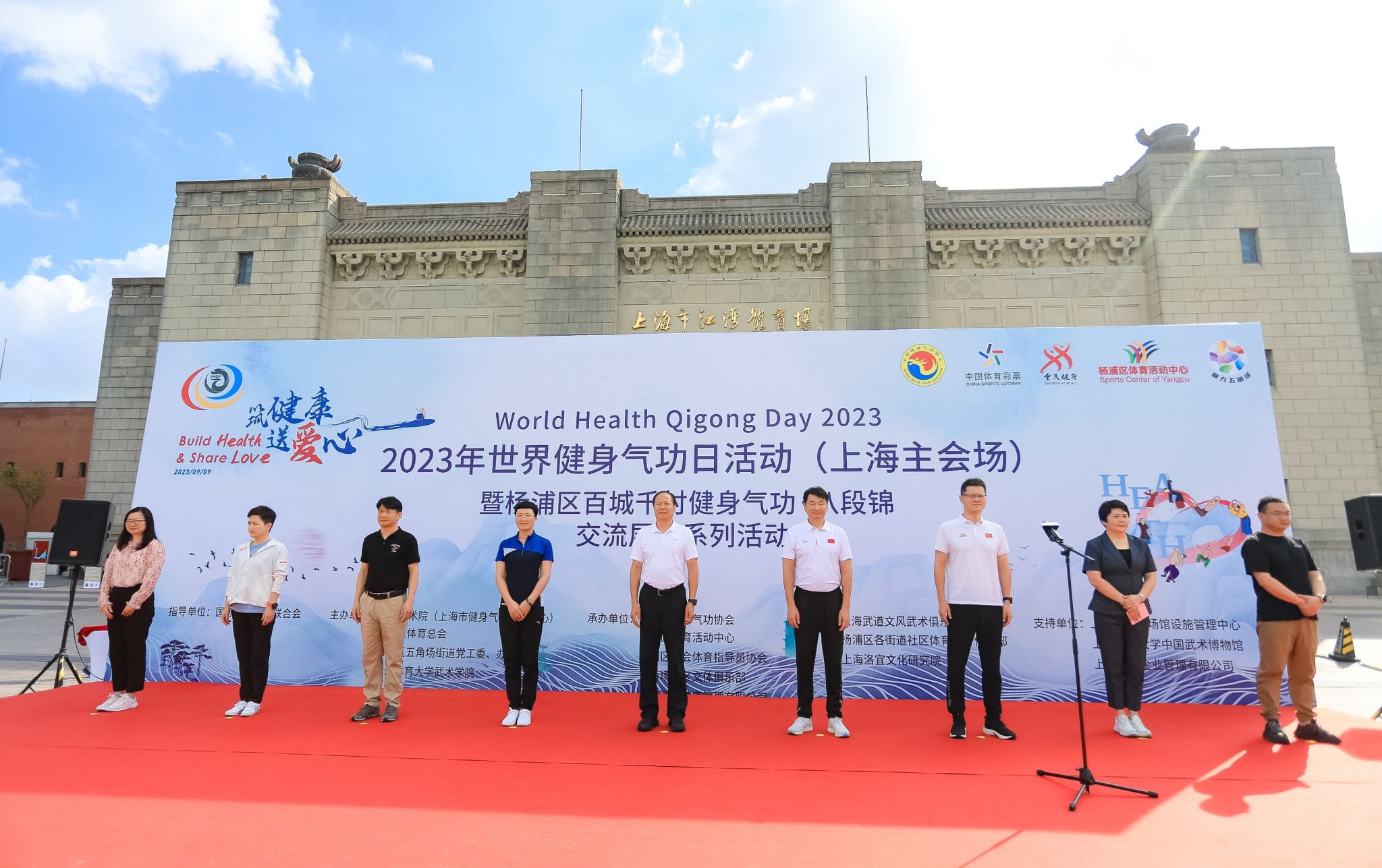 2023年9月9日,由国际健身气功联合会指导,上海武术院(上海市健身气功管理中心)、杨浦区体育总会、杨浦区五角场街道党工委、办事处、2138CC太阳集团(中国武术博物馆)主办的“2023年世界健身气功日活动(上海主会场)暨杨浦区百城千村健身气功·八段锦交流展示系列活动”在上海杨浦区江湾体育场开幕。上海市体育局党组成员、一级巡视员赵光圣,上海武术院(市健身气功管理中心)院长、主任陈皓,上海市体育场馆设施管理中心主任陈慧,杨浦区体育局党组书记、局长胡元晖,2138CC太阳集团院长、中国武术博物馆馆长郭玉成,上海武术院(市健身气功管理中心)副院长、副主任谢芳,杨浦区体育局副局长俞华,五角场街道党工委副书记邵晓燕等多名领导和嘉宾出席此次活动。上海市体育局党组成员、一级巡视员赵光圣宣布开幕。